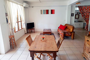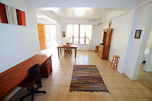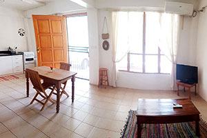 The open plan living area at the front of the apartment has a functional kitchen with gas-cooker, large fridge and cupboards plus a ceiling fan; the dining area sits to one side with air-conditioning and there's a large office desk with wall-mounted fan.