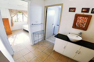 Off this open plan room is an enclosed dress room with sink and separate bathroom along with the guest bedroom with windows on 2-sides and a ceiling fan.