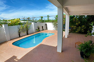 It offers an open plan kitchen, dining area and office space at the front, a lounge in the middle and two separate bedrooms, one ensuite, plus two verandas - one looking towards the front and a smaller veranda overlooking the swimming pool (not accessible by tenants).