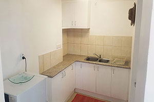 There's a security door and wooden door leading into to the lounge area which has two Pacific Green lounge seats. The room opens into an L-shaped kitchen with a fridge, 4-burner gas oven/stove and plenty of cupboard space.