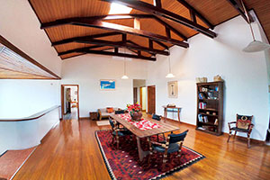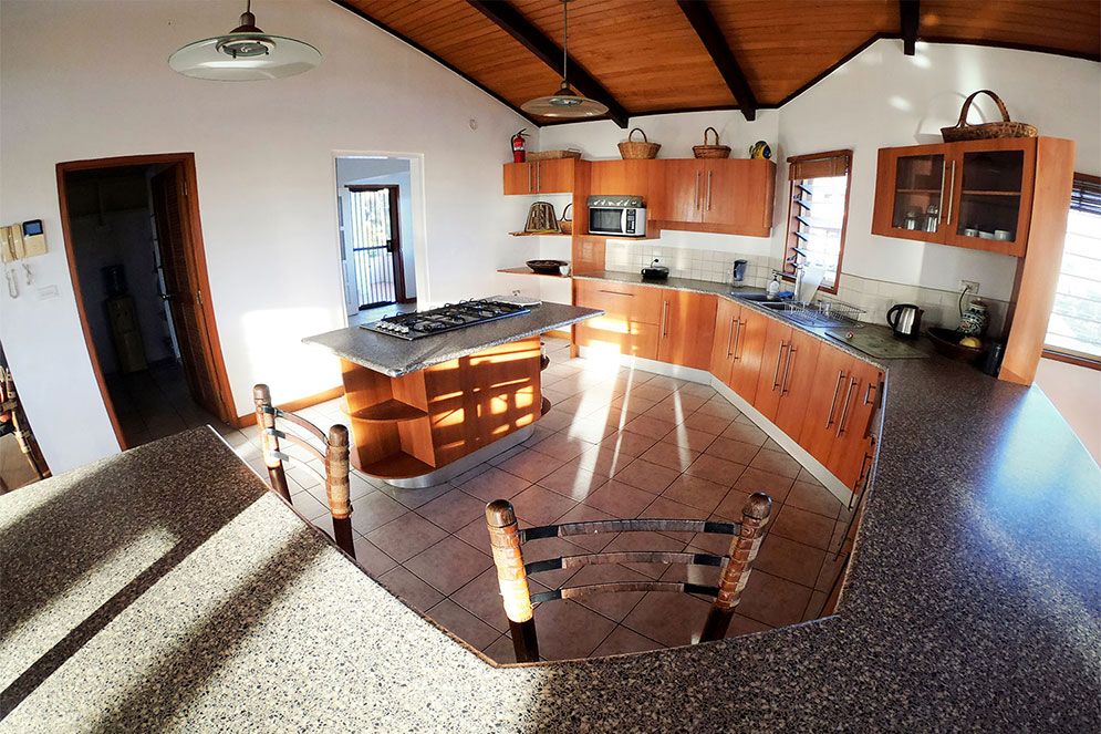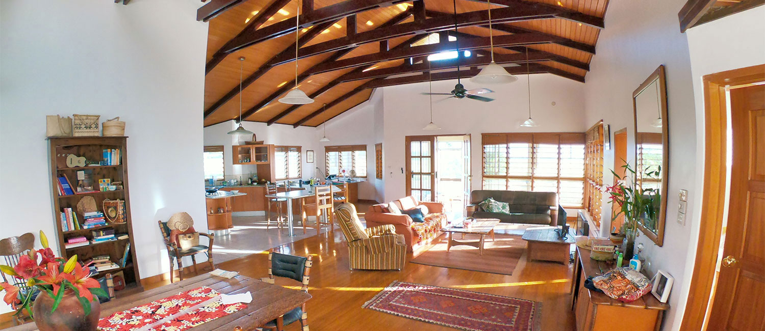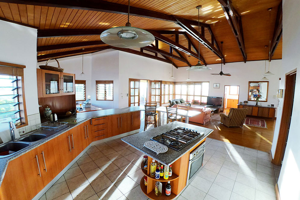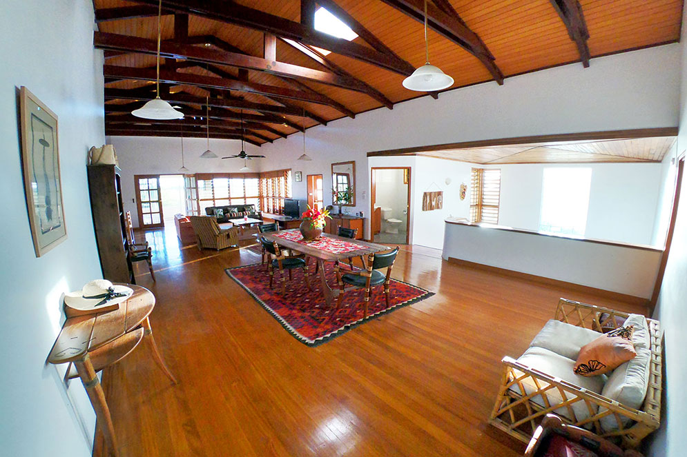 The huge open plan kitchen / dining and lounge area has 5-metre high open beamed ceiling and polished wooden floorboards and large windows with sweeping views towards the ocean and enjoys cool sea breezes.