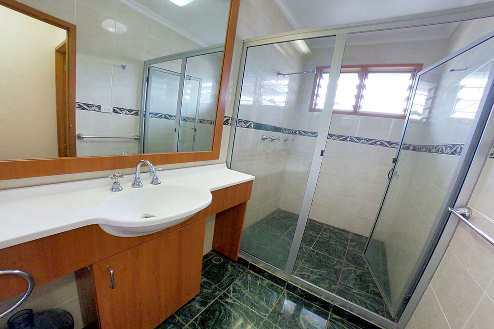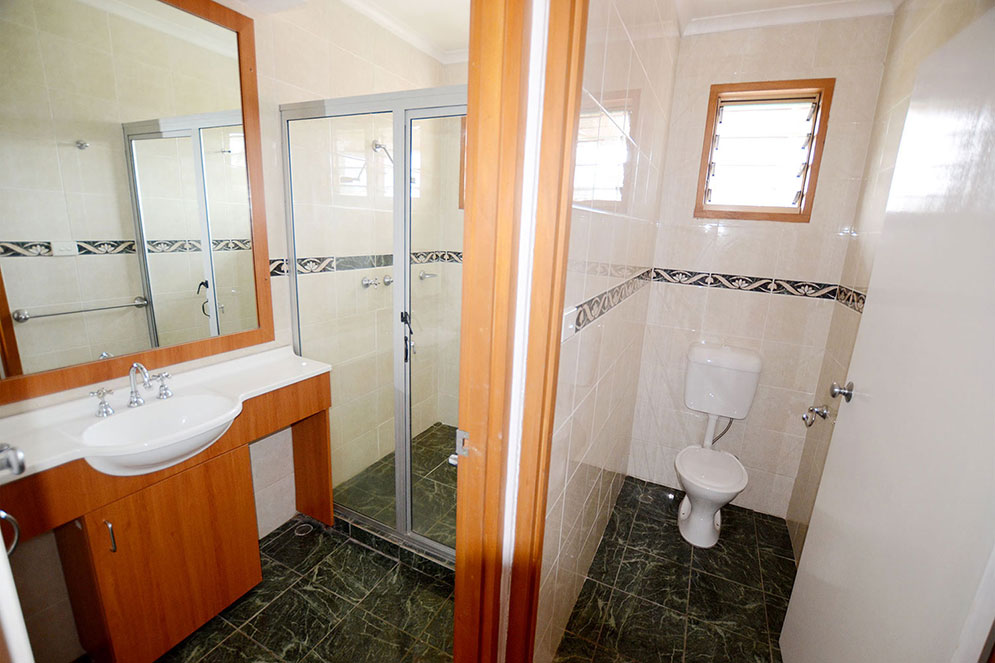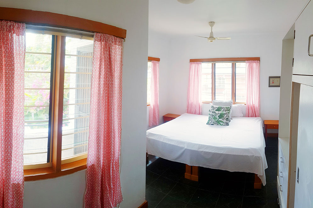 The apartment's main bedroom is air-conditioned, with King bed and has built-in cupboards and a private veranda. A second bedroom also has built-in cupboards and ceiling fan. Both share a large bathroom and separate toilet and there's a second guest toilet across the hallway.